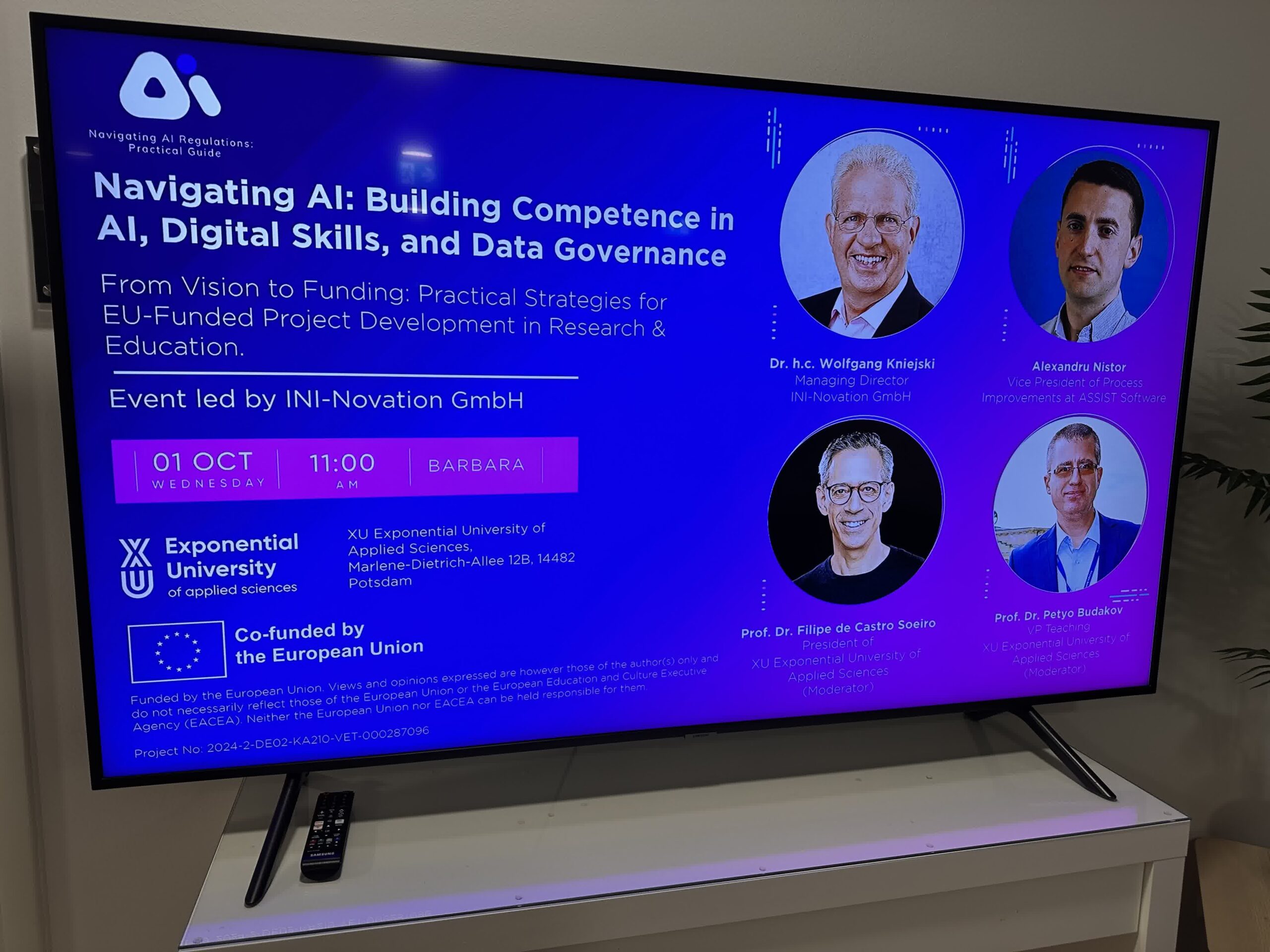 On October 1st, 2025, INI-Novation GmbH, in collaboration with Budakov Films, hosted an engaging Multiplier and Dissemination Workshop at the XU Exponential University of Applied Sciences in Potsdam, Germany. The event, titled “Navigating AI: Building Competence in AI & Digital Skills for the Creative Industry” (Project Number: 2024-2-DE02-KA210-VET-000287096), brought together creative professionals, educators, and technology experts to explore one of today’s most critical intersections—artificial intelligence and creativity.
