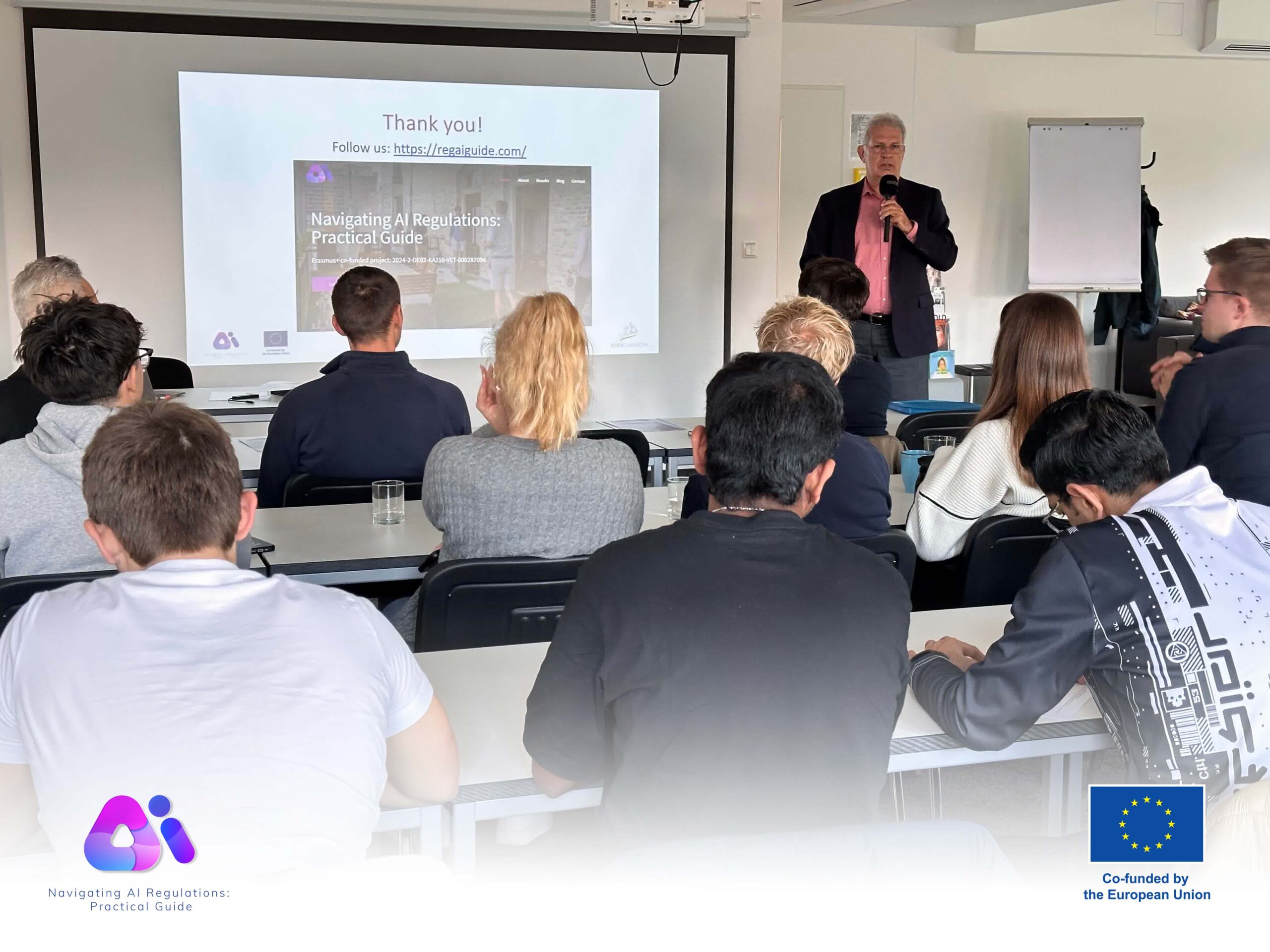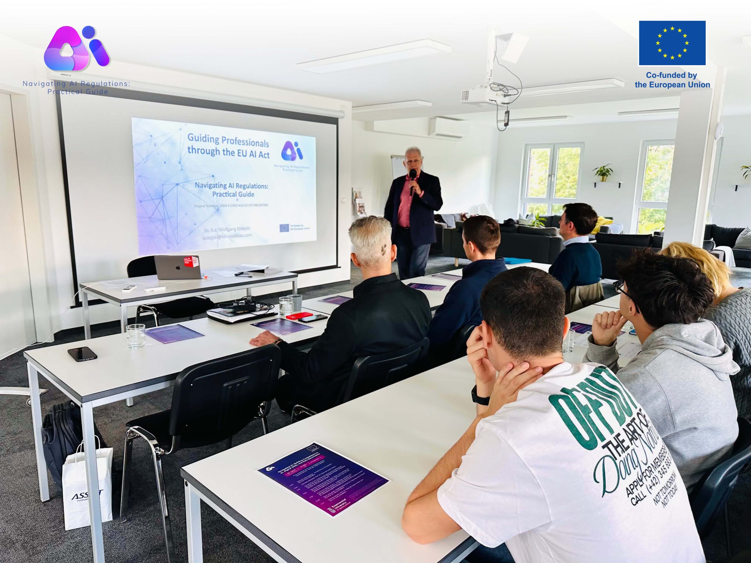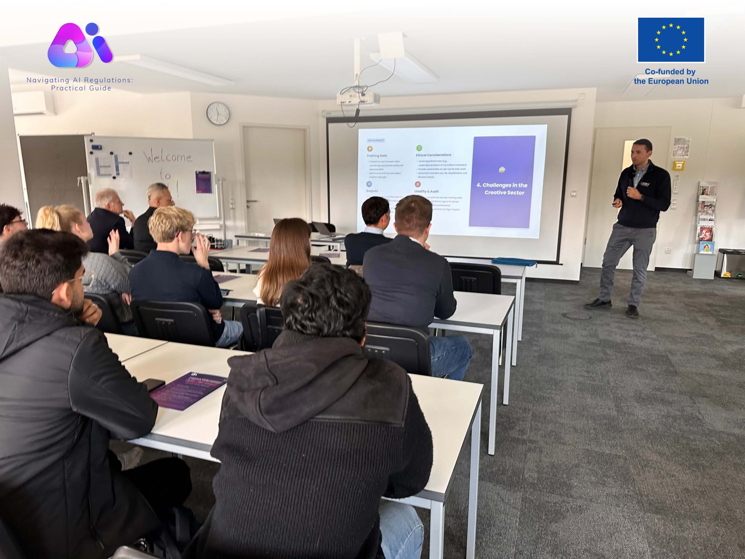 Dr. Wolfgang Kniejski, Managing Director of INI-Novation GmbH, introduced the Erasmus+ project “Navigating AI: Building Competence in AI & Digital Skills for the Creative Industry.” He highlighted its mission to equip creative professionals with the knowledge to navigate AI regulation responsibly. Participants were introduced to the project’s training modules and educational videos, available on YouTube, which serve as accessible tools for freelancers, educators, and SMEs across Europe.