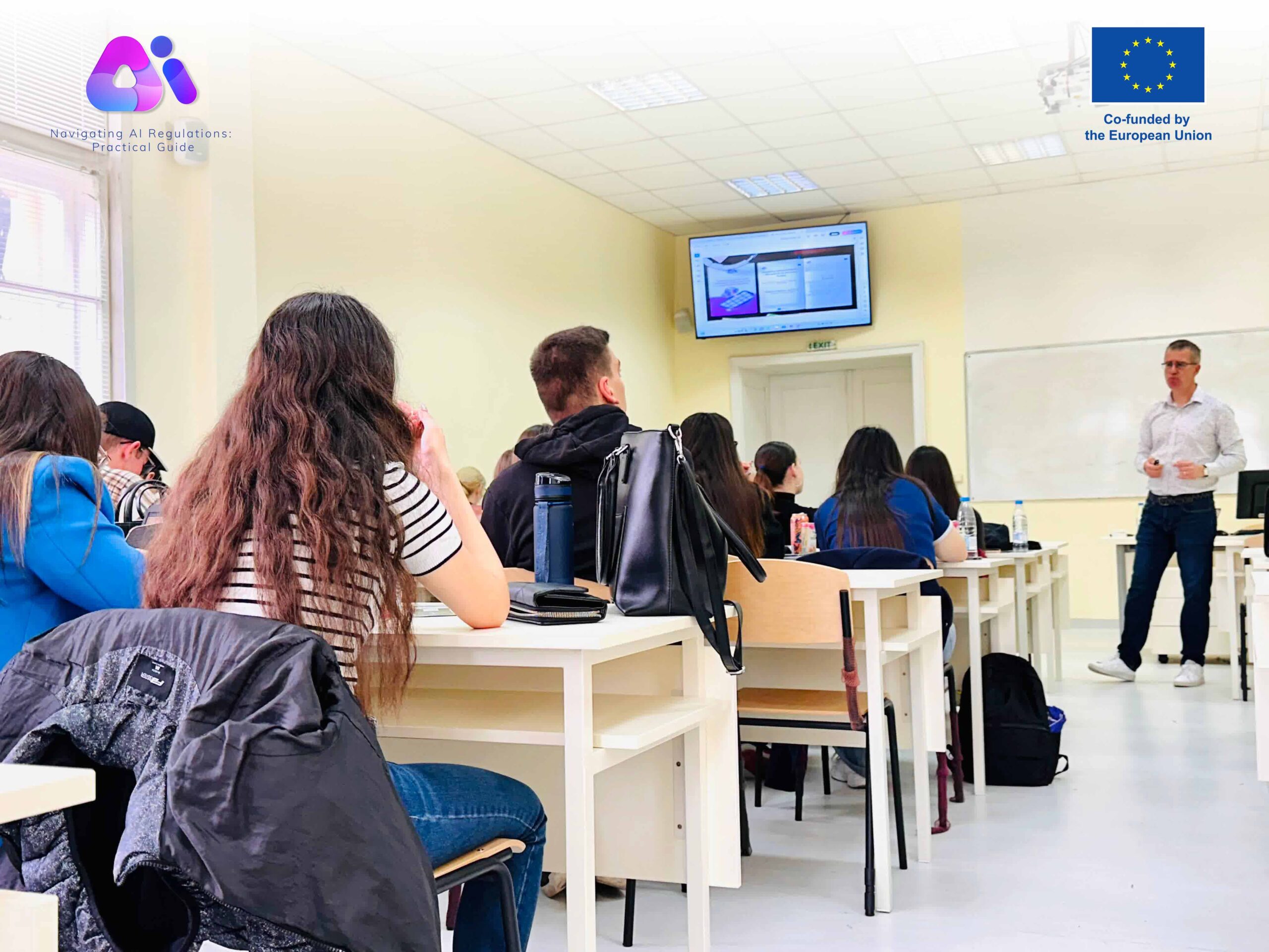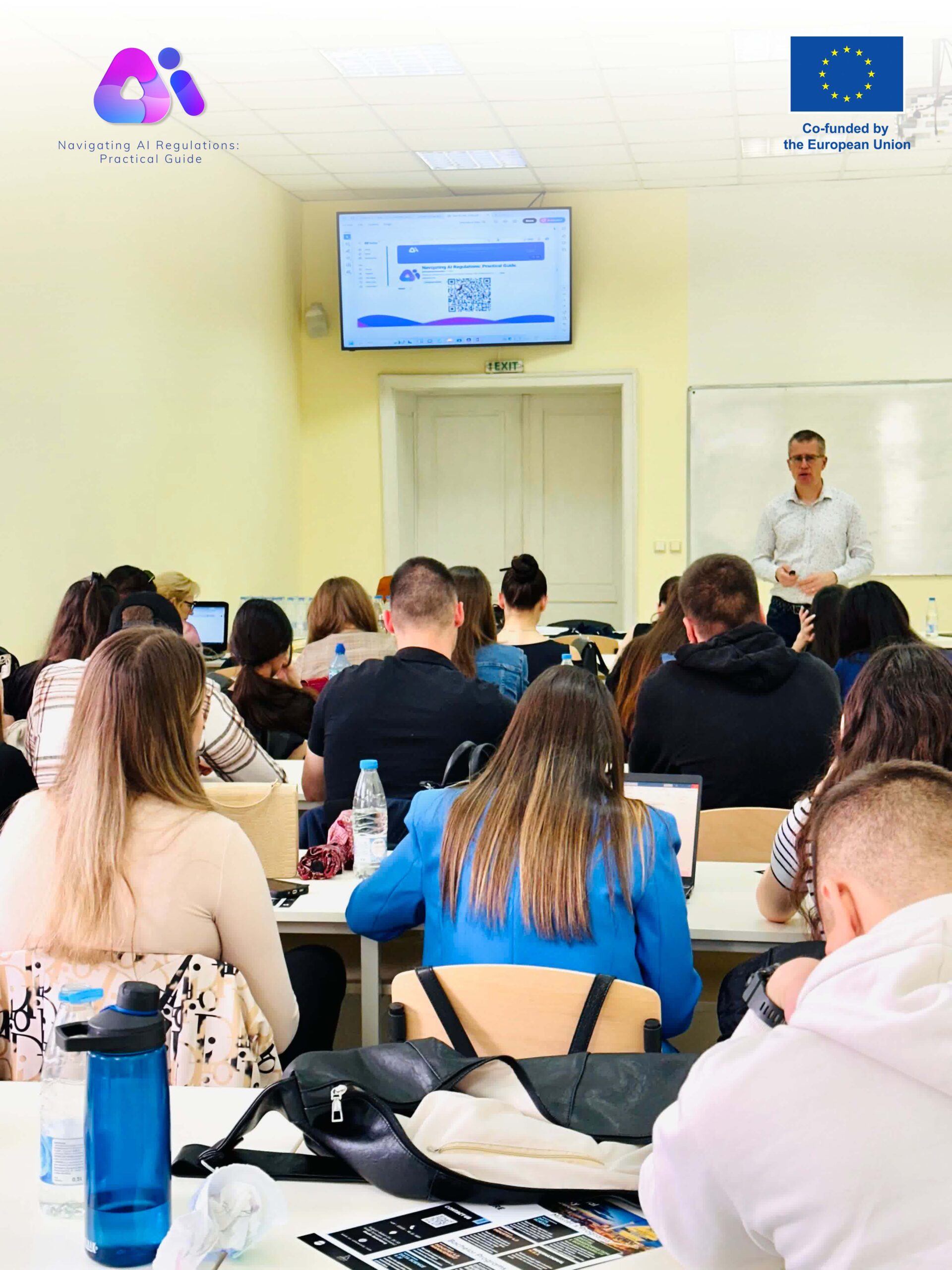 The event aimed to promote the project’s main intellectual output – the Training Program “Navigating AI Regulations: Practical Guide”, which supports professionals and educators in understanding and applying AI technologies ethically and responsibly within creative contexts. Attendees included university lecturers, researchers, designers, digital artists, AI enthusiasts, and students, all actively engaged in discussions on how artificial intelligence can enhance creativity while ensuring compliance with EU standards and ethical principles.