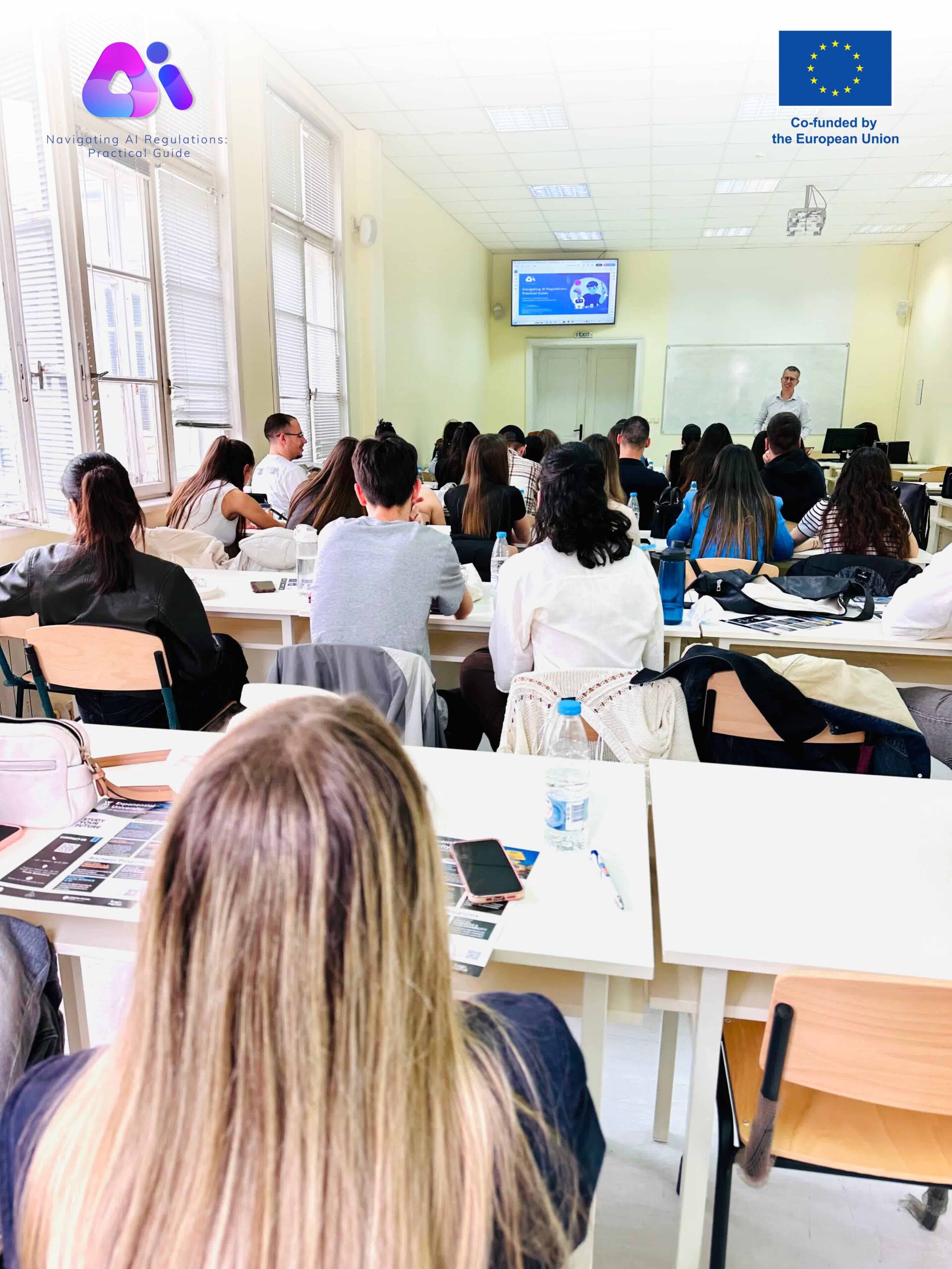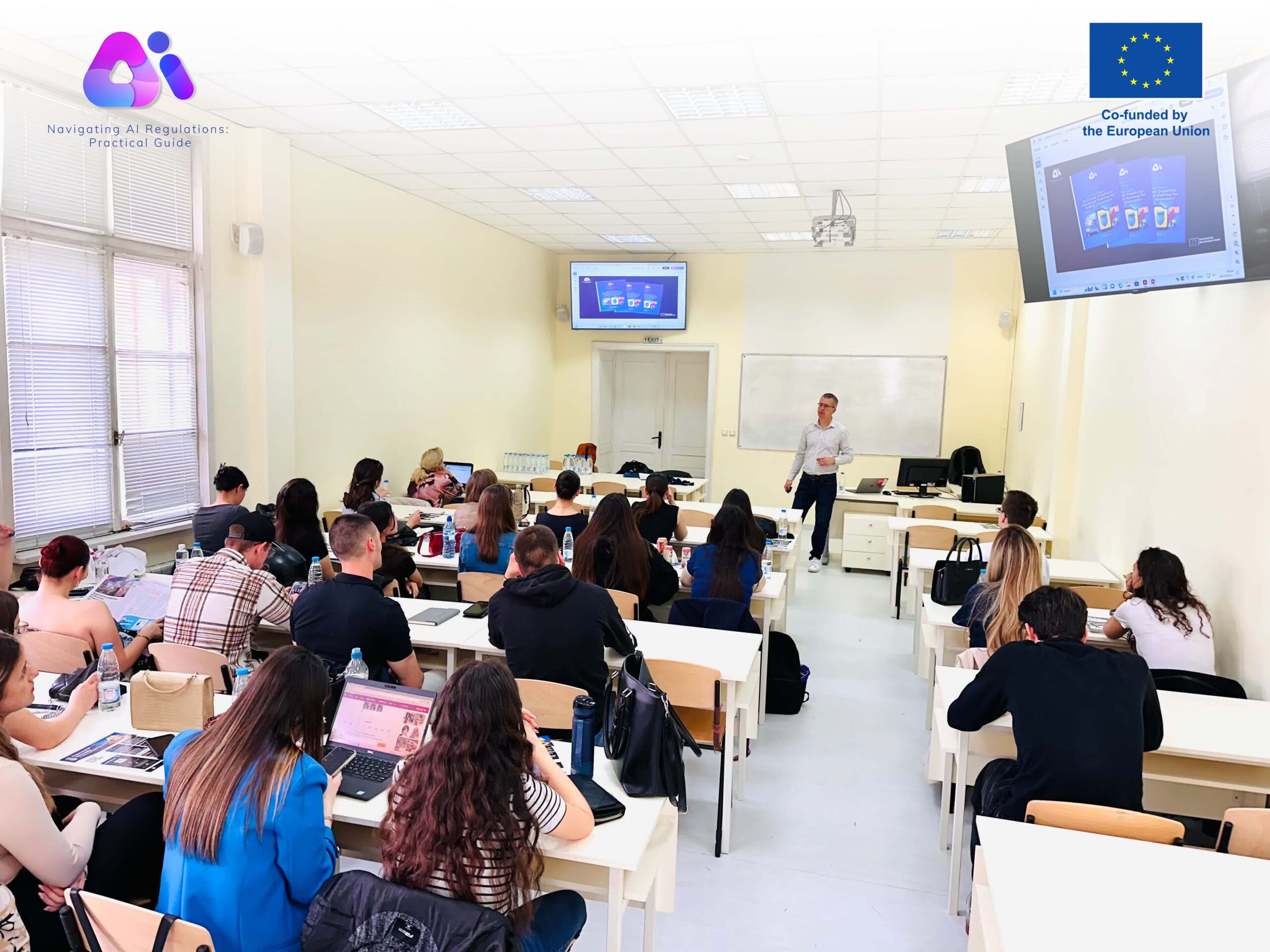 On 27 October 2025, the Faculty of Journalism and Mass Communication at Sofia University “St. Kliment Ohridski”hosted the Bulgarian Open Public Event of the Erasmus+ project “Navigating AI Regulations: Practical Guide” (Project Number: 2024-2-DE02-KA210-VET-000287096), organized by Budakov Films as part of Activity 3: Hands-On Training and Community Engagement. The event marked a significant milestone in disseminating the project’s results, drawing 33 participants from academia, the cultural and creative sectors (CCS), and the entrepreneurial ecosystem.
